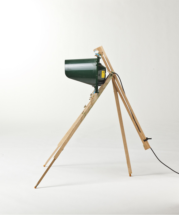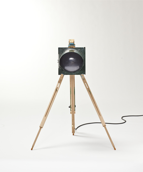 Diese komponierte Grenzerfahrung des Designs besteht aus zwei primären Komponenten, aus einer grünen Singallleuchte einer Ampelanlage und einer Staffelei anstelle eines Stativs. Weil Leuchten mit Stativ aus Fotostudios oder Filmsets bekannt sind, würde dies ein bekanntes Schema erfüllen.